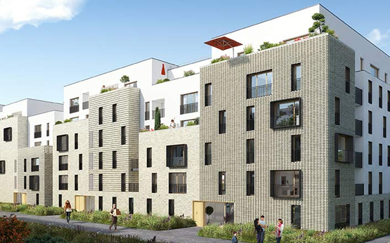 C’est au 35, rue Henri Barbusse que se déploie la très belle façade de la réalisation “Le Goncourt”. Résolument novatrice, elle offre une volumétrie variée en jouant subtilement sur l’alternance de larges ouvertures, de balcons et de terrasses. Les cadres saillants en aluminium brossé, les garde-corps en verre et les menuiseries en bois rythment tour à tour les façades de couleur blanche. L’utilisation de matériaux nobles et de briques pleines moulées main confèrent à la résidence un cachet indéniable. La résidence étudiante se réapproprie cette écriture architecturale afin de s’intégrer dans cet environnement de qualité.